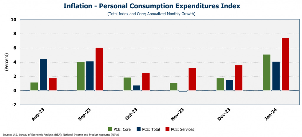 There is just one problem. Inflation is actually getting a lot hotter. Yes, compared to a year ago it is moving in the right direction, and that is what everyone in the media will report. However, if you take the month-to-month changes in the index, and annualize them, PCE has been accelerating since November, and is now running over 4%! January core PCE is running over 5% on an annualized basis, and January services PCE came in at 7.4% on an annualized basis! That is NOT what the Fed wants to see and it makes rates cuts any time soon much less likely. In fact, the evidence seems to suggest that current Fed policy is not sufficiently restrictive to return inflation back to 2%.