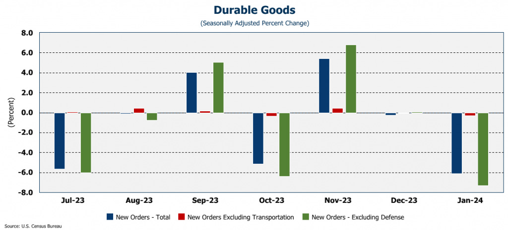 New orders for durable goods dropped sharply in January, down 6.1% from December. Economists had expected a drop of only 4.8%. New orders excluding transportation were expected to rise in January, but actually declined 0.3%. New orders excluding defense orders dropped 7.3%...the biggest drop since the first months of COVID. In short, the only positive part of the January durable goods report was the defense sector, but regular consumers are not ordering durable goods.