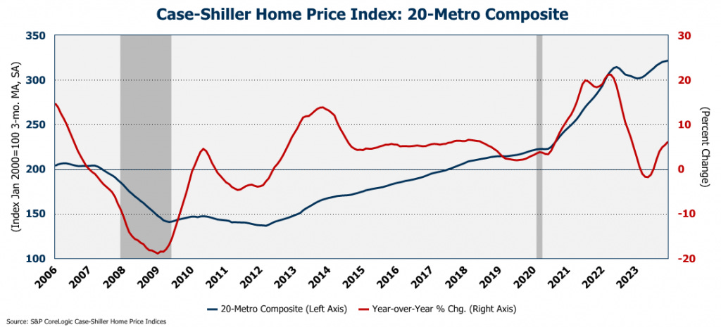 The Case-Shiller Home Price Index for December was released this week, and confirms a lot about what we already know about housing. The index is somewhat delayed, but in December, the index for the 20 largest metro areas rose for the 11th consecutive month and posted a record high. According to the index, the prices in the 20 largest metros are 6.2% higher than they were a year ago, and for the nation as a whole, prices are 5.5% higher. Again, as previously mentioned, this price support is due to the persistent shortage of homes for sale. And, with mortgage rates remaining high, this is unlikely to change.