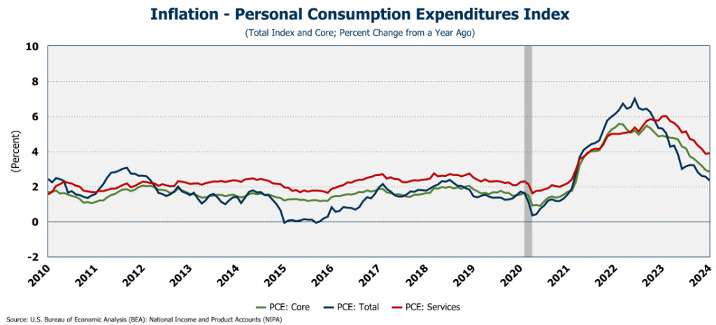 Inflation, as measured by the Personal Consumption Expenditures (PCE) Index, came in just as expected at 2.4% year-over-year. Core PCE (PCE ex. food and energy) came in at 2.8%, and PCE for service is still high at 3.9%. To look at the graph, everything appears good...inflation is heading down, and while it is still above the Fed's target, it is moving in the right direction.