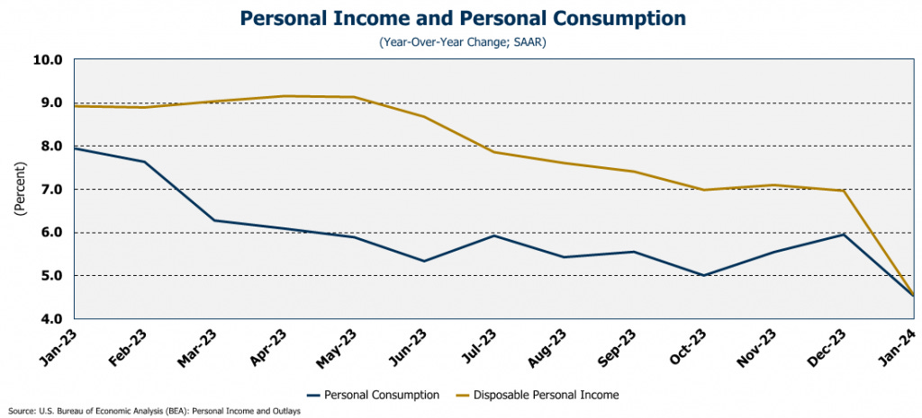 Despite the positive nominal numbers, it is clear that both income and consumption are slowing. Annual growth for both measures trended down for all of 2023, and both fell off sharply in January to just over 4.5%. For personal spending, (which is a major component of the U.S. economy) that the lowest level since early 2021.