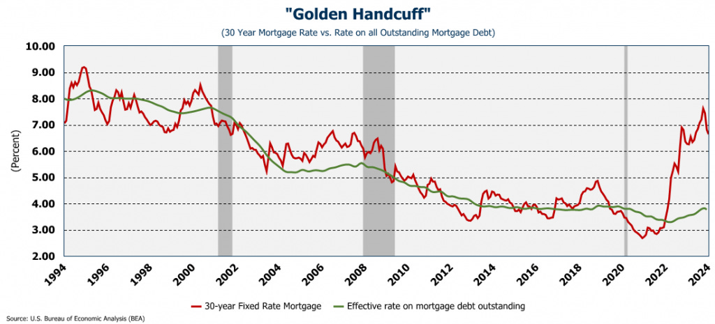 With mortgage rates still "high" relative to recent history, people are unwilling to let go of their current home. There is still a 300 basis point difference between the current 30-year mortgage rate, and the rate on all outstanding mortgage debt. The latter is rising slowly, but is still well below 4%.