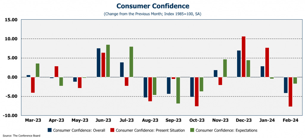 After three months of growth, consumer confidence fell in February. Survey respondents cited economic uncertainty and persistent inflation as concerns, although they are less concerned about food and gas prices. In addition, they are concerned about the labor market (wait...what? I thought the labor market was strong?!?) as well as the political environment with the 2024 Presidential contest right around the corner. And the decline was across the board as confidence in both the present situation and future expectations fell in February.